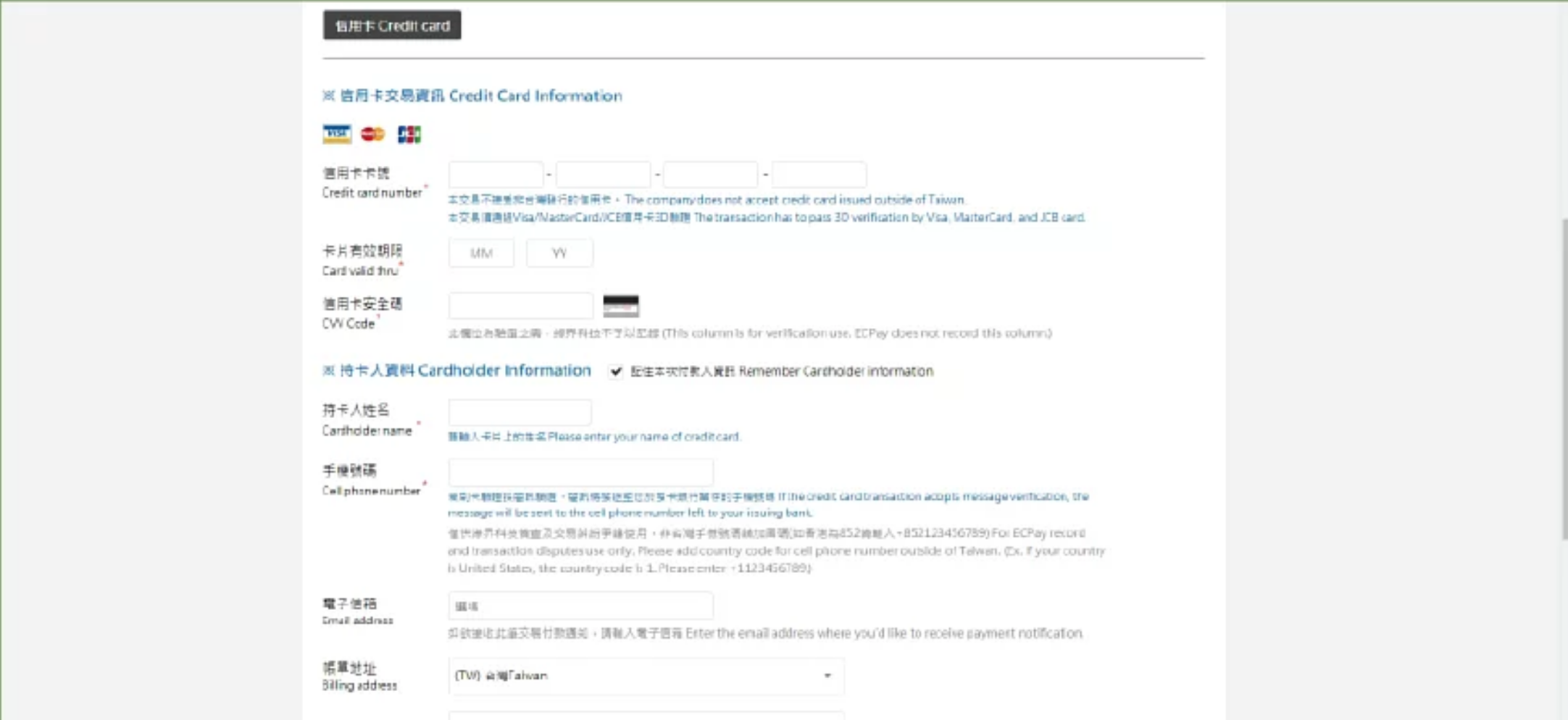 輸入您的信用卡交易資訊、持卡人資料等等,如:信用卡姓名、卡號和卡片有效日期和背後的末3碼