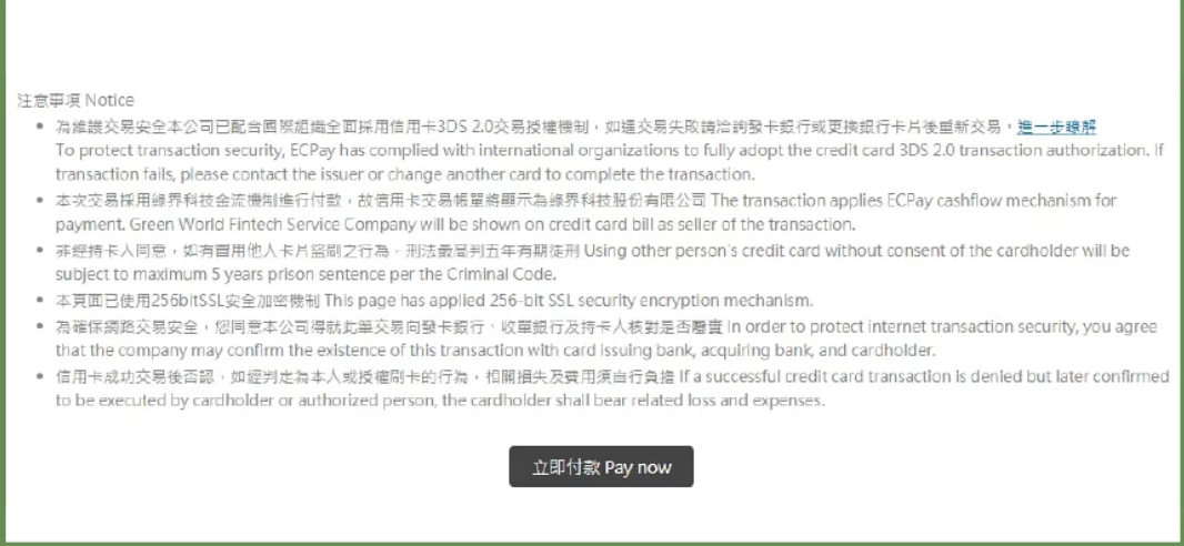 這邊要注意的是卡號不能打錯,整個畫面也不能操作太久(例如 5分鐘以上),這些都會被綠界科技認為是付款失敗的原因喔~