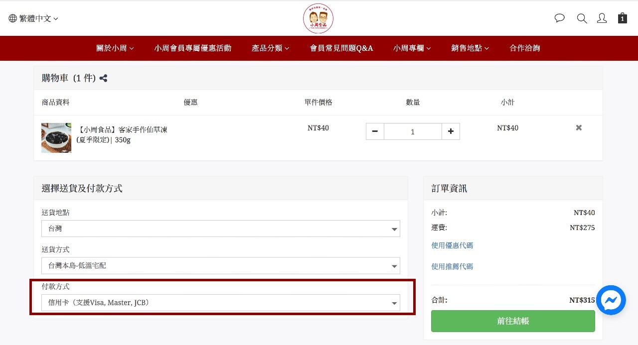 目前小周食品提供4種付款方式,分別是信用卡、ATM轉帳、LINE Pay、貨到付現