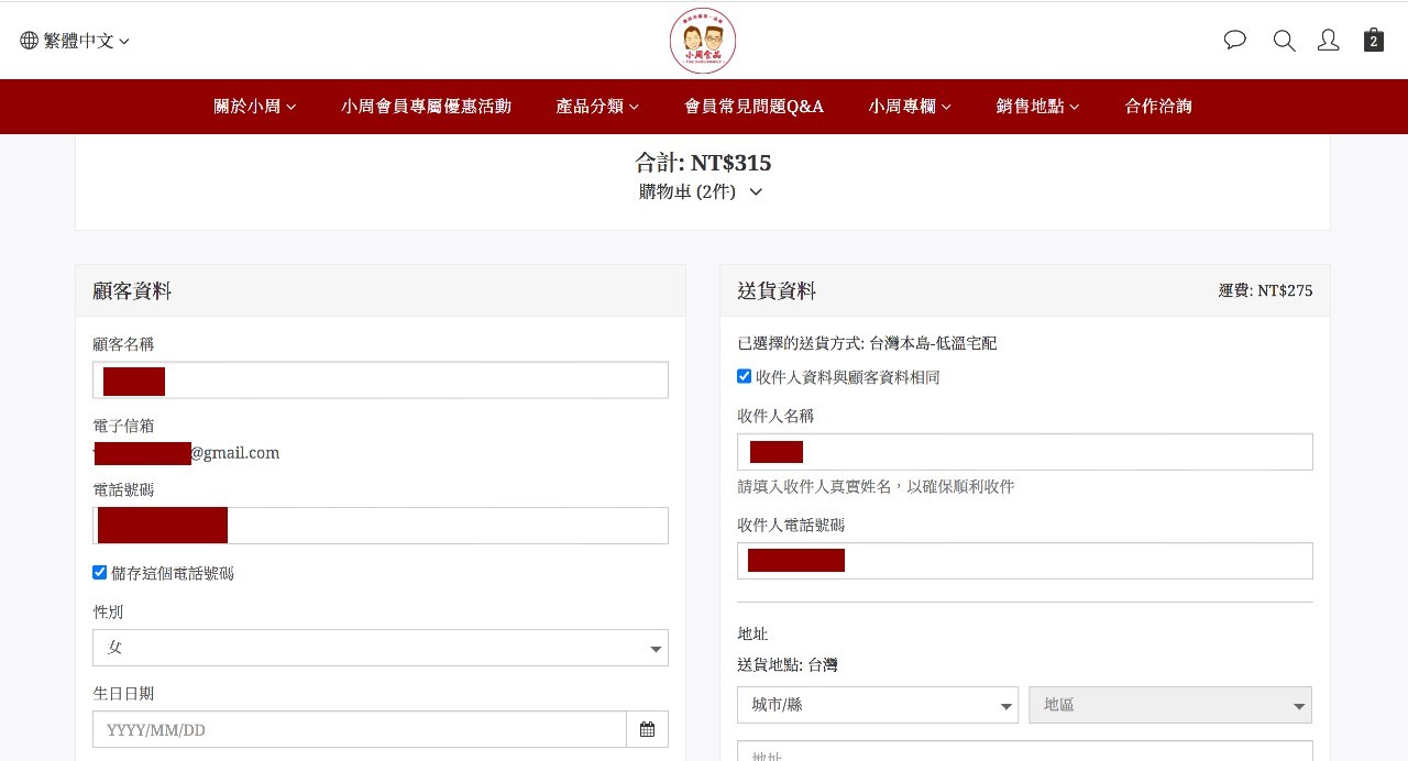 一開始在按下「訂單結帳」之後會看到的訂購清單, 然後再把畫面往下移到「選擇送貨及付款方式」的地區