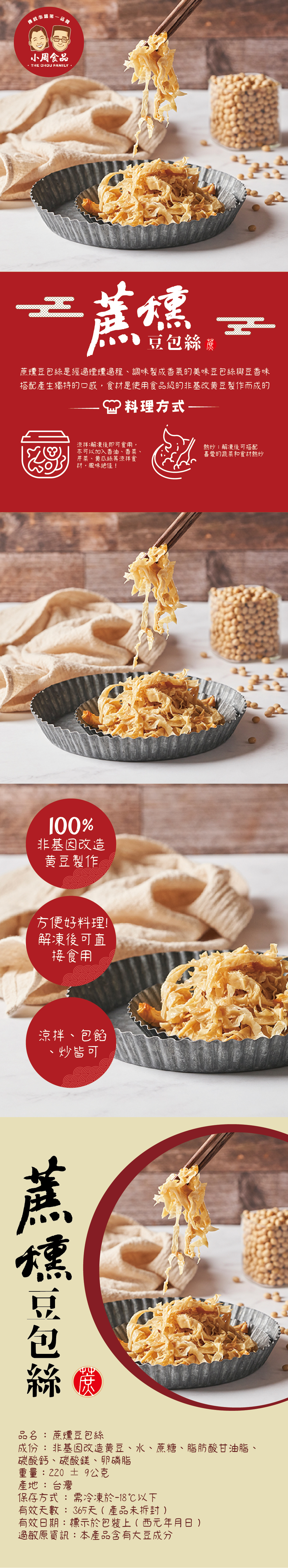 使用本家生機天然手作非基改「黃金豆包」切成絲後經過獨家蔗糖秘方煙燻而成,蔗燻與豆香味完美體現出相輔相成的精神,保留了原始豆香,燻黃色的外表配上了滑順有嚼勁的口感,一入口衝至鼻腔的是煙燻味,吞入喉回甘的是豆香味,這味回甘,並不一般。
