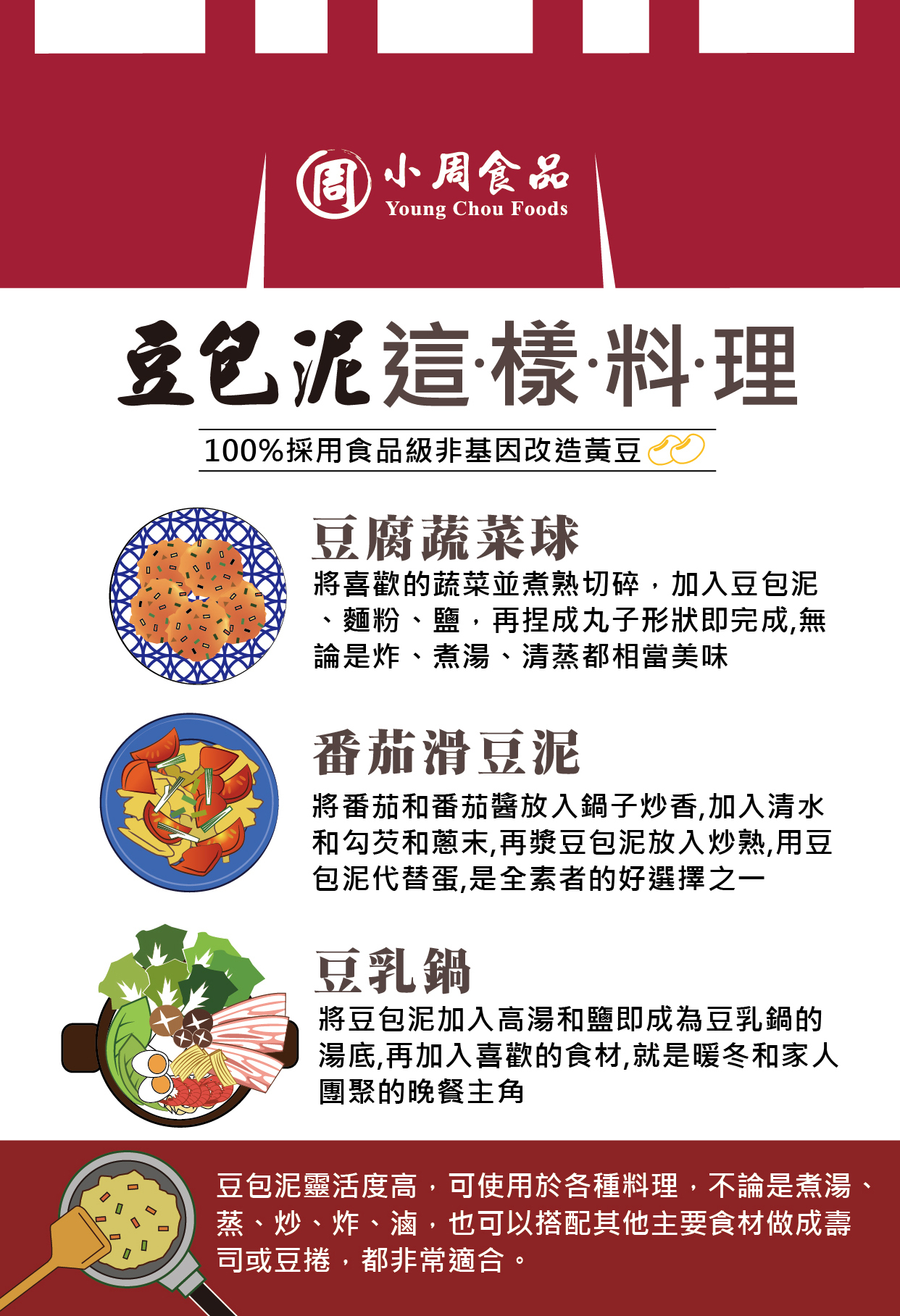 小周食品的「豆包泥」是由一格格方形豆漿爐出生的「黃金豆包」,裡面為豆包以及「豆漿」綜合在一起製成,介於豆包和豆漿之間,口感非常有層次感,就是我們素食界的「蛋」,有蛋的口感和香氣,卻是純素的,你敢相信!?在料理後的口感或是手法都像蛋一樣,堅持不添加人工色素,用最簡單的食材,給您最簡單的幸福。